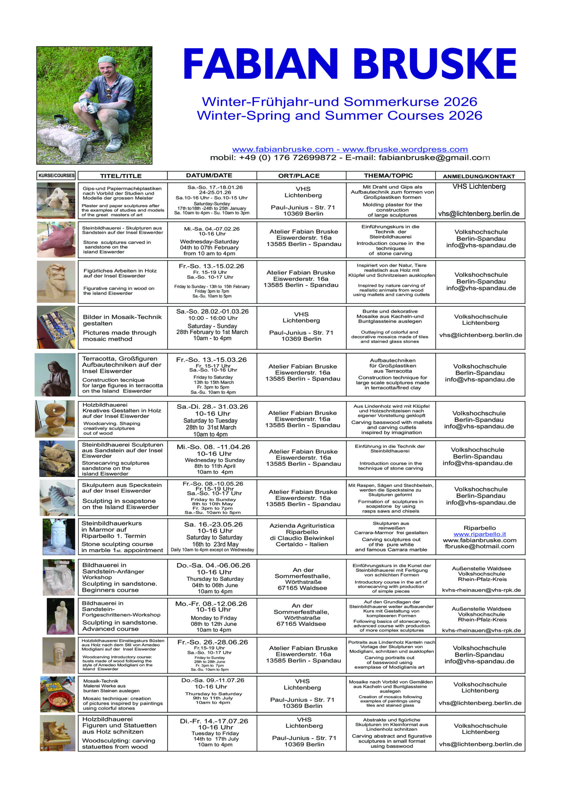 Bis zum Juli 2026 laufen die folgenden Kurse für Holzbildhauerei, Steinbildhauerei, Plastisches Formen in Gips und auch Ton, sowie auch in Mosaik. Viele davon finden in meinem Atelier auf der wunderschönen Insel Eiswerder statt. Bei Interesse können Sie mich gerne Anschreiben oder unter der Spalte Kontakt, sich direkt an der richtigen Stelle anmelden.