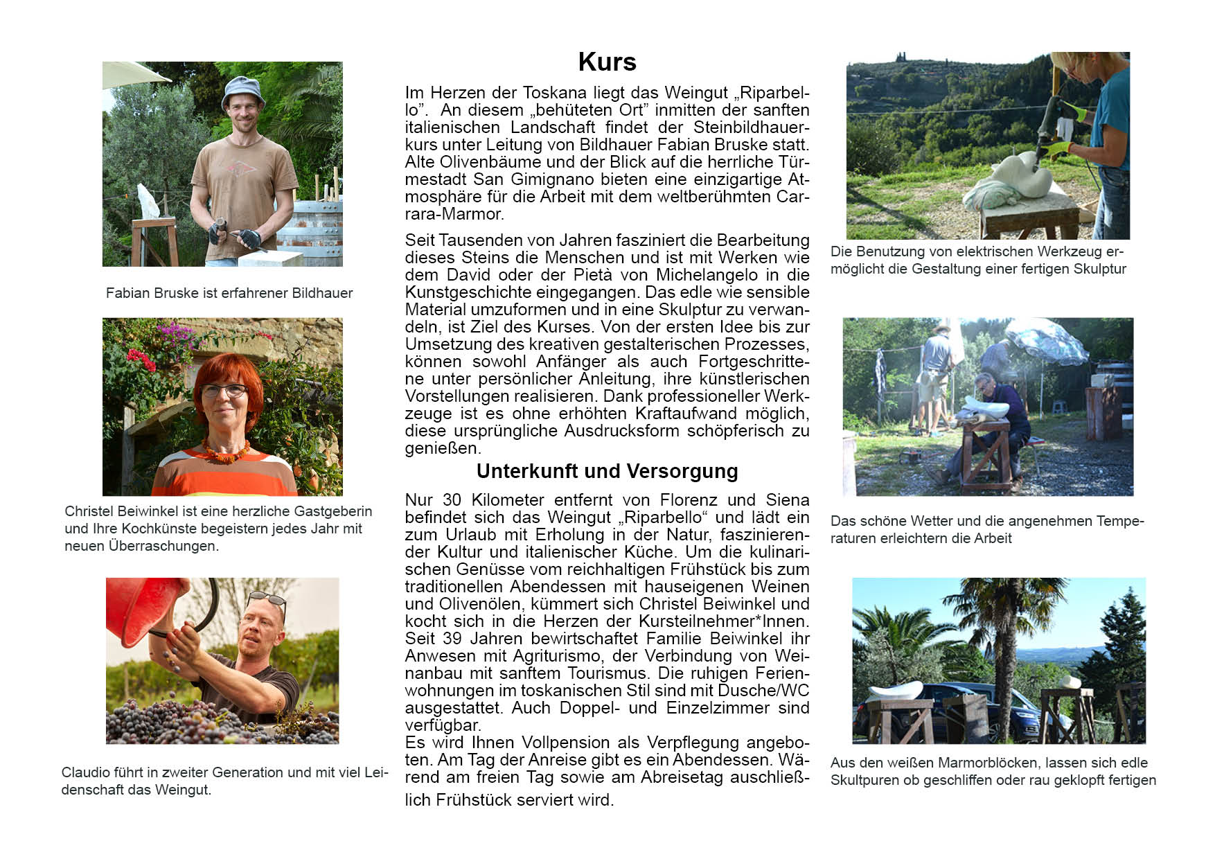 Bis zum Juli 2026 laufen die folgenden Kurse für Holzbildhauerei, Steinbildhauerei, Plastisches Formen in Gips und auch Ton, sowie auch in Mosaik. Viele davon finden in meinem Atelier auf der wunderschönen Insel Eiswerder statt. Bei Interesse können Sie mich gerne Anschreiben oder unter der Spalte Kontakt, sich direkt an der richtigen Stelle anmelden.